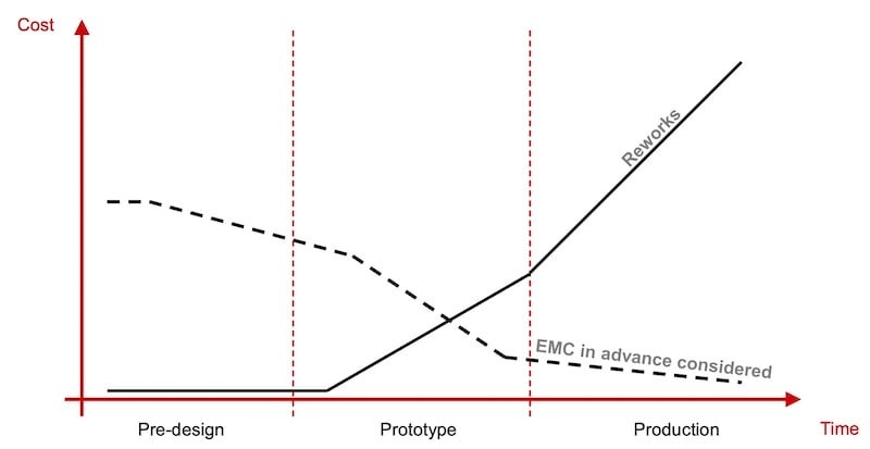 Si observamos la gráfica (figura 2) de costo vs tiempo dentro del ciclo de desarrollo de un producto, vemos reflejado el impacto de las pruebas de EMC, que, en caso de no realizarse a tiempo, produce un incremento de costos significativo en la etapa de producción.